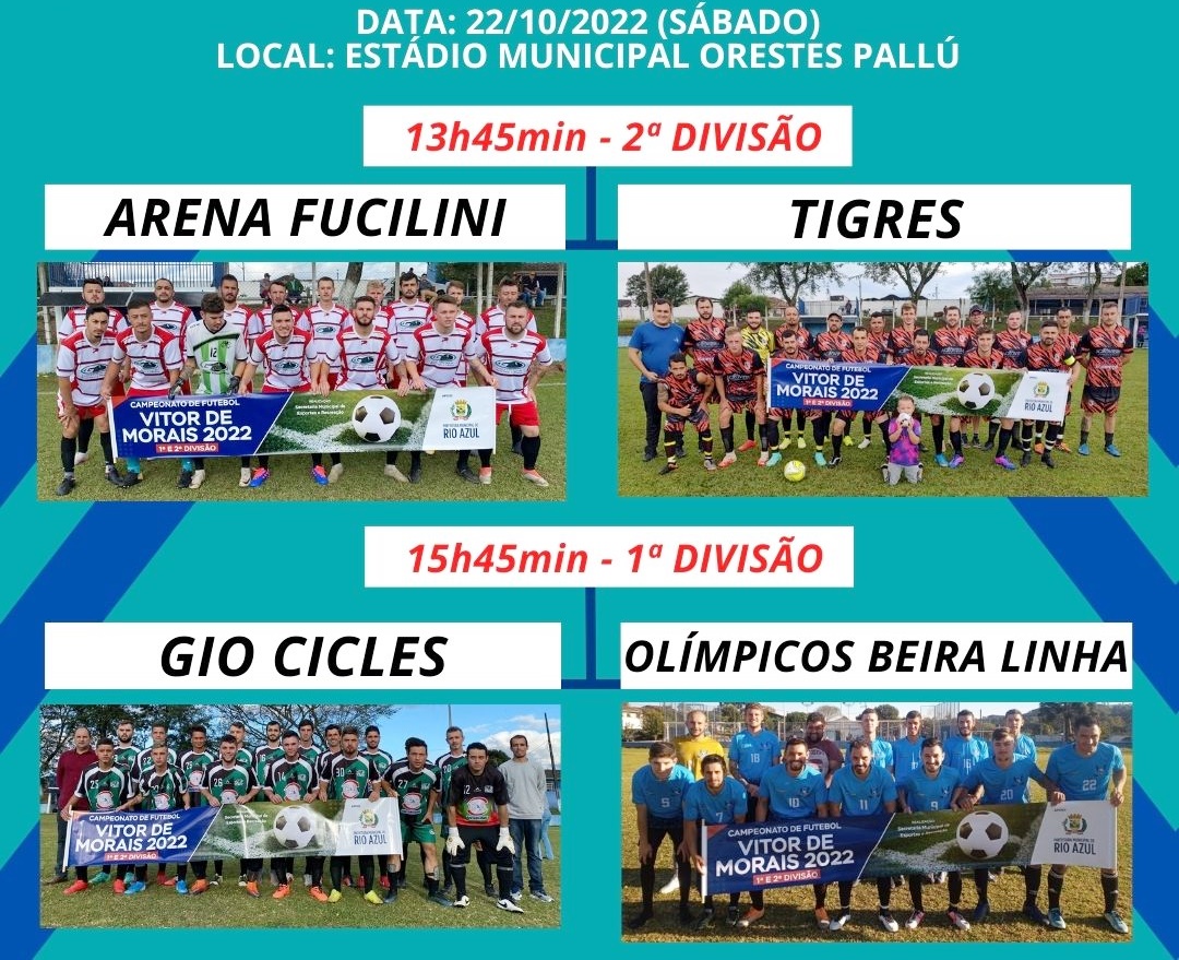 Neste sábado, 22, serão definidos os campeões do Campeonato de Futebol Vitor de Morais, em Rio Azul. As finais das duas divisões serão realizadas no estádio Municipal Orestes Pallú.