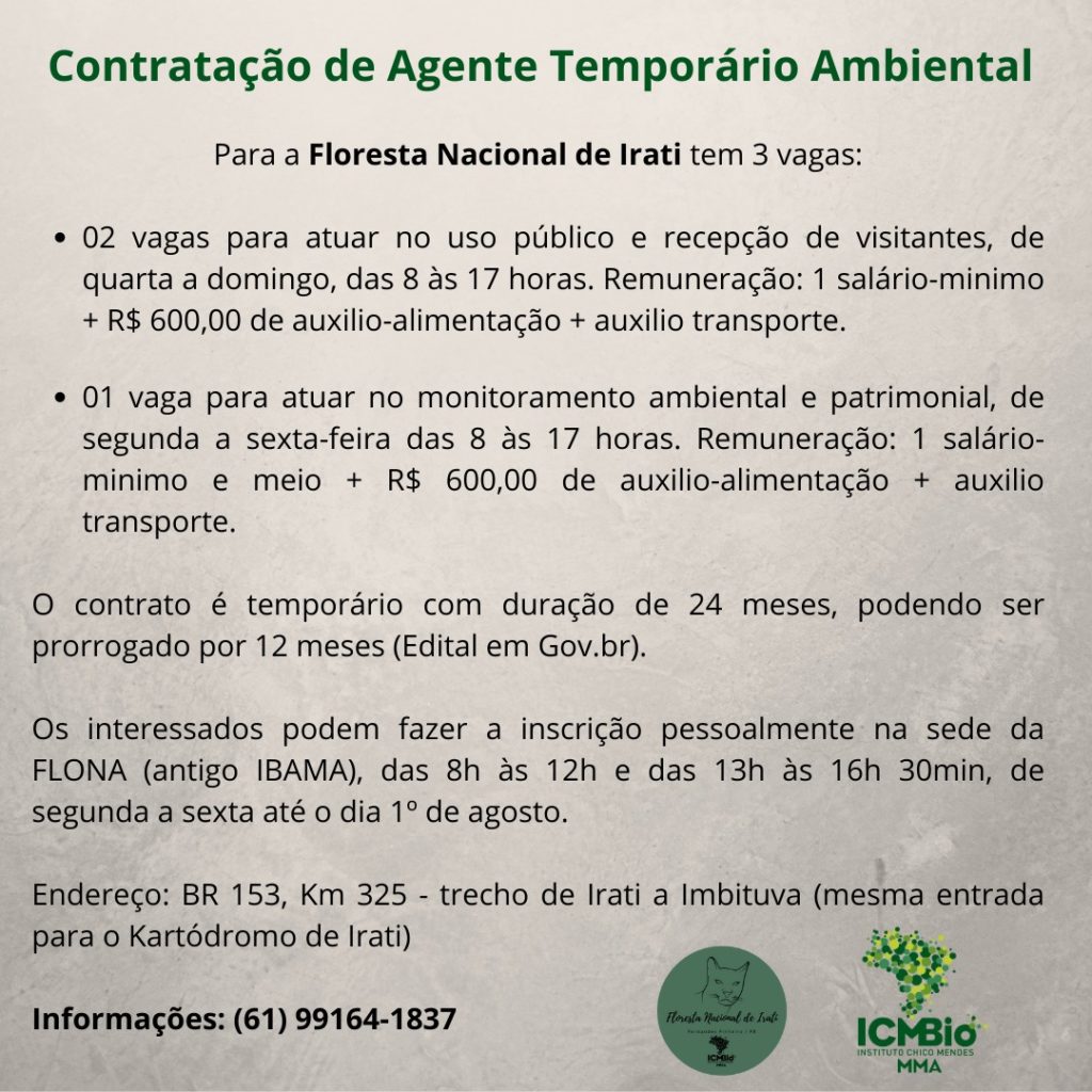 A Floresta Nacional de Irati (Flona) realizará a contratação de três pessoas para trabalhar como agente temporário ambiental.