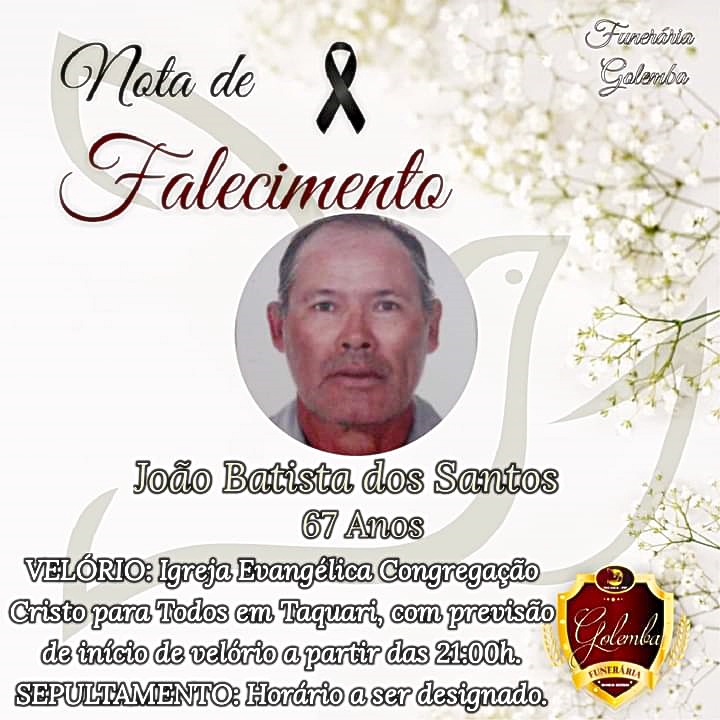 O corpo de João Batista está sendo velado na Igreja Evangélica Congregação Cristo para Todos, em Taquari. Ainda não foram definidos local e horário do sepultamento.
