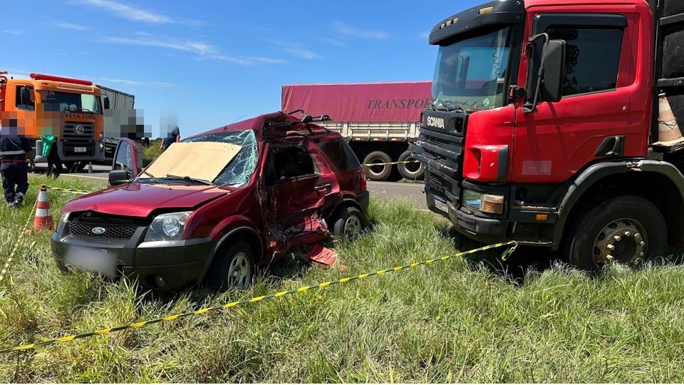 Motorista de Ecosport morreu no local do acidente após colisão contra caminhão. Esposa do condutor ficou ferida