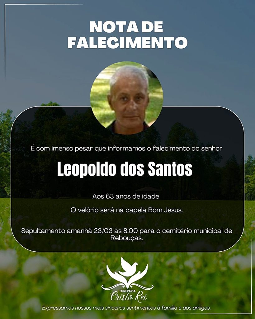 De acordo com informações da Funerária Cristo Rei, o velório de Leopoldo está acontecendo na Capela Bom Jesus. O sepultamento será nesta segunda-feira, 23, às 08 horas, no cemitério municipal de Rebouças.
