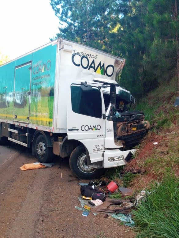 Motorista do caminhão da empresa Coamo morreu no local do acidente. Foto: PRE/Divulgação