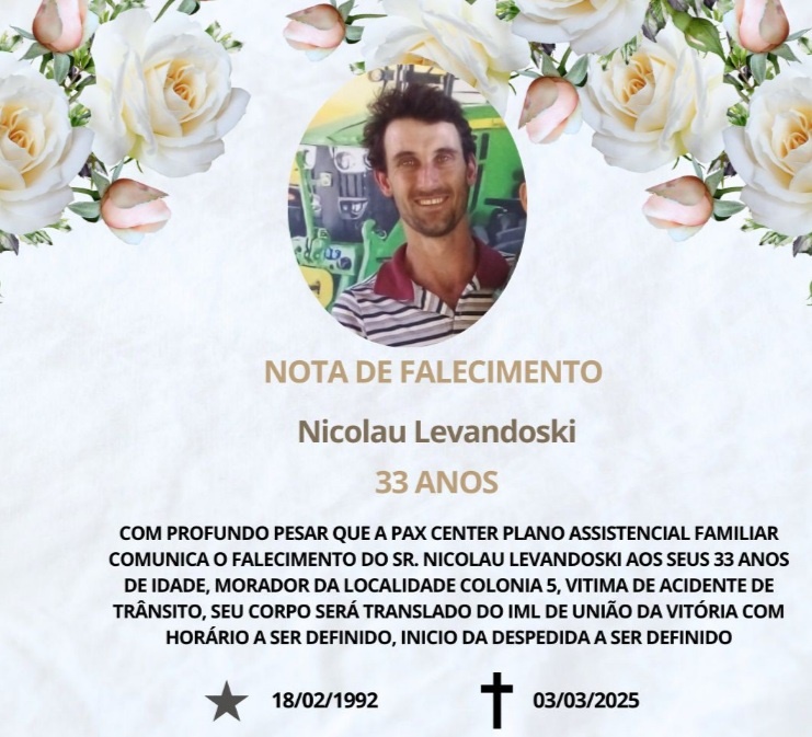 O motociclista Nicolau Levandoski, de 33 anos, chegou a ser socorrido em estado grave pela equipe dos bombeiros comunitários. Ele recebeu atendimento da ambulância da secretaria Municipal de Saúde e foi levado ao hospital São Pedro, em Mallet. Porém, ele não resistiu aos ferimentos e faleceu. O corpo dele foi encaminhado ao Instituto Médico-Legal (IML) de União da Vitória. O velório de Nicolau está acontecendo em sua residência, na Colônia 5, em Mallet.
