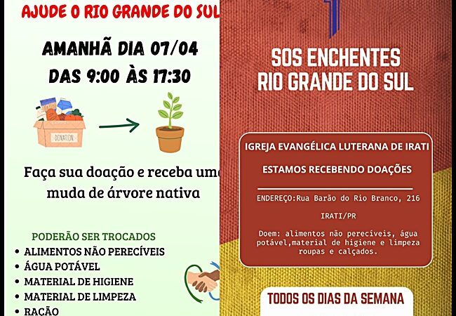 Paróquias de Irati – As paróquias da cidade também estão recebendo donativos que serão encaminhados para o Rio Grande do Sul. As doações também podem ser deixadas diretamente no Corpo de Bombeiros, na Rua Coronel Emílio Gomes, em frente à Prefeitura, na Afubra e nos supermercados da rede G Center.