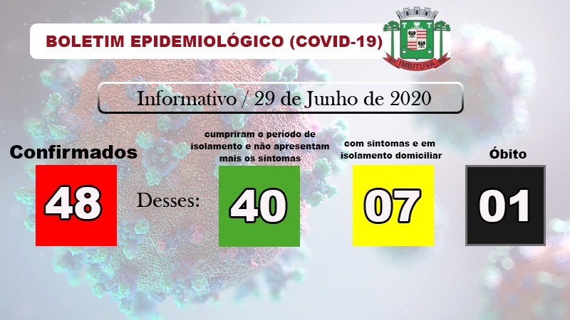 Mais três pacientes estão recuperados em Imbituva. Desta forma, o Boletim Epidemiológico desta segunda-feira, 29, registra 48 casos de Covid-19 em Imbituva. Quarenta imbituvenses já cumpriram o período de quarentena e são considerados curados. Sete pessoas estão em isolamento domiciliar e uma mulher morreu por complicações causadas pela doença.