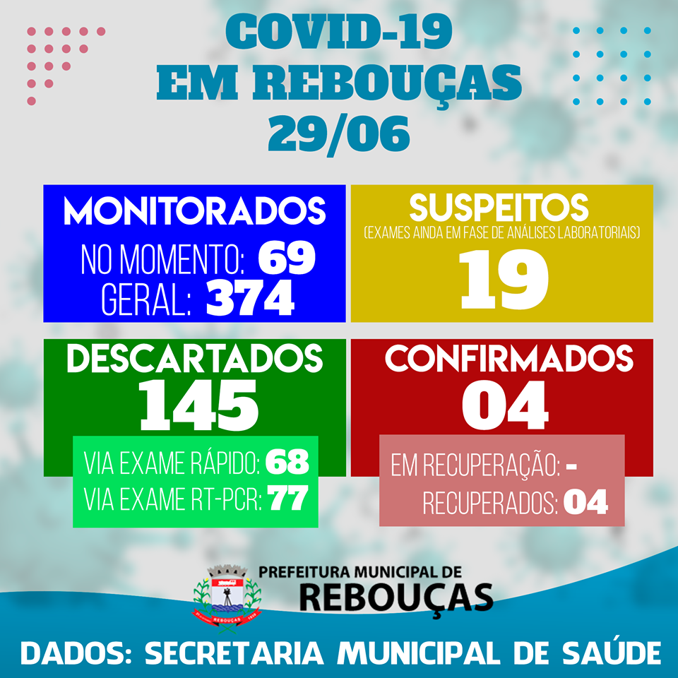 Em Rebouças, o único caso que estava ativo se recuperou, conforme o boletim da secretaria Municipal de Saúde. A quarta paciente contaminada no município havia sido uma gestante na faixa etária entre 20 e 25 anos. Com isso, os quatro reboucenses infectados estão recuperados. São 19 pessoas aguardando resultado do exame e 69 em monitoramento. O número de casos descartados subiu para 145, sendo que 68 realizaram testes rápidos e 77 testes no método RT-PCR.