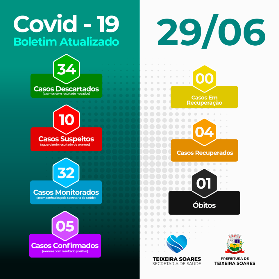 Teixeira Soares registrou mais dois munícipes recuperados. Sendo assim, a cidade também zerou a quantidade de casos ativos. Agora, são quatro moradores recuperados e um óbito registrado, totalizando cinco casos. Dez pessoas aguardam resultado do exame e 32 estão sendo monitoradas. Trinta e quatro casos foram descartados com resultado negativo do exame.