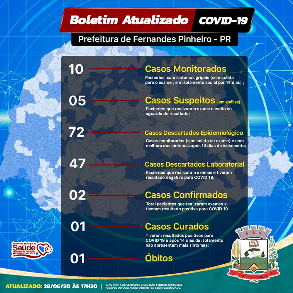 Em Fernandes Pinheiro já foram diagnosticados dois casos de coronavírus. Um homem morreu e uma mulher está recuperada. Cinco casos estão em análise aguardando resultado do exame e dez moradores seguem em monitoramento. 119 casos foram descartados, sendo 72 por critério epidemiológico e 47 por critério laboratorial (resultado negativo do exame).
