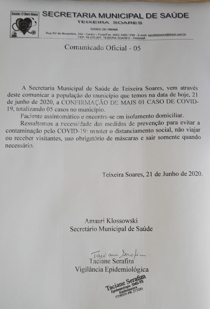 Teixeira Soares também diagnosticou mais um caso de Covid-19. A mulher, de 67 anos, que reside no interior do município, é esposa do terceiro caso registrado no município. Ela não tem comorbidades (outras doenças associadas). “[A moradora] apresentou dor de garganta, febre e dor no corpo, mas já está assintomática [sem sintomas], fazendo o tratamento domiciliar. Com isso, o município totaliza cinco casos. Reforçamos o uso de máscara, isolamento social e distanciamento para que a gente consiga fazer o controle dessa pandemia”, relata o secretário de Saúde, Amauri Klossowski.