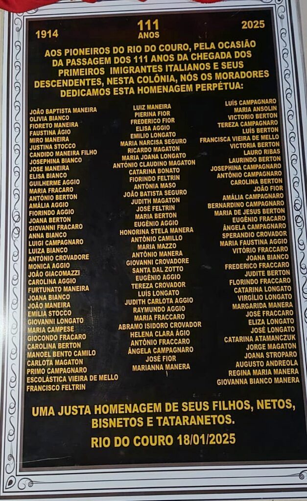 Logo após a missa, foi inaugurada uma placa com os nomes dos 102 imigrantes vindos da Itália para a região do Rio do Couro há 111 anos. Em seguida, foi servido um jantar comemorativo no pavilhão da capela.