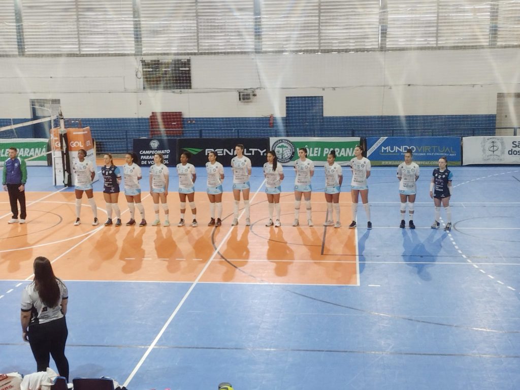 Jogadoras de Irati perfiladas para execução de hinos antes do jogo de estreia no Campeonato Paranaense de Voleibol Feminino contra São José dos Pinhais. Foto: Secretaria de Esportes de Irati