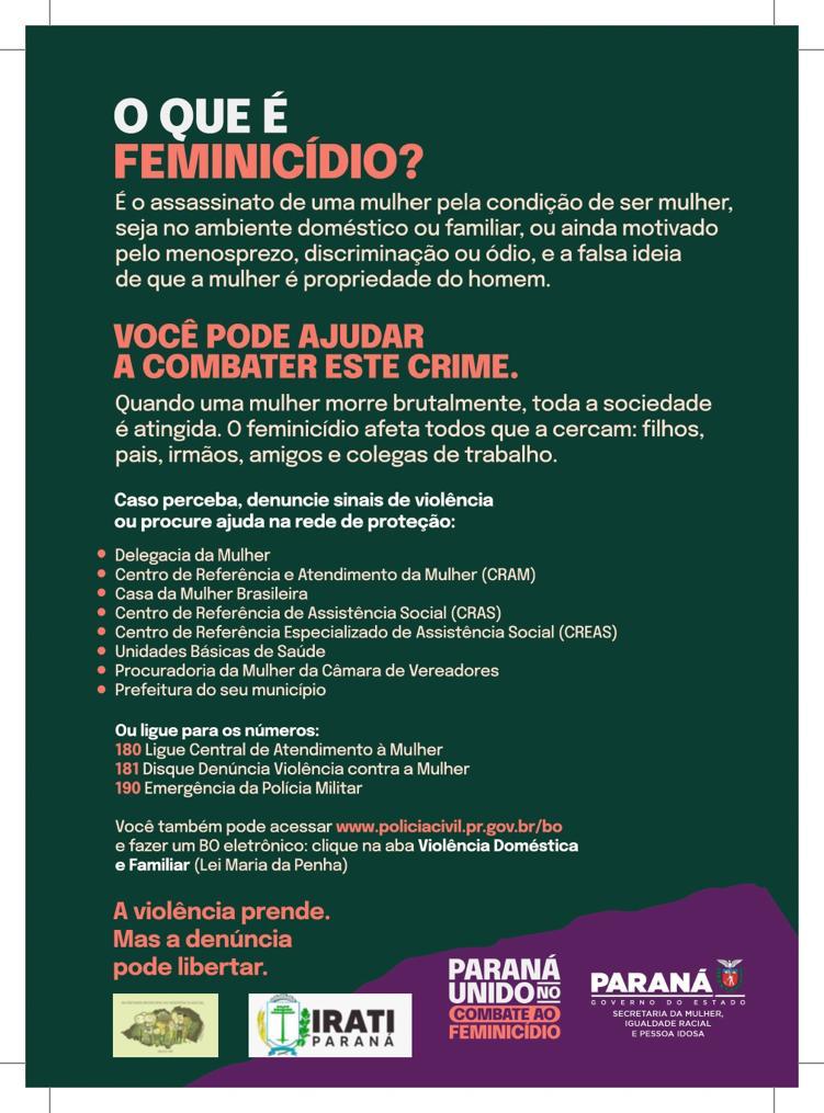 A secretária de Assistência Social de Irati, Sybil Dietrich, disse que todas as formas de violência contra as mulheres devem ser combatidas. “Essa triste realidade só será possível de ser mudada com a nossa união. Venha participar, é no próximo sábado, ao meio dia, a concentração é na Rua da Cidadania com destino à Praça da Bandeira. Faça a sua parte. É o Paraná Unido contra o feminicídio”, disse a secretária.