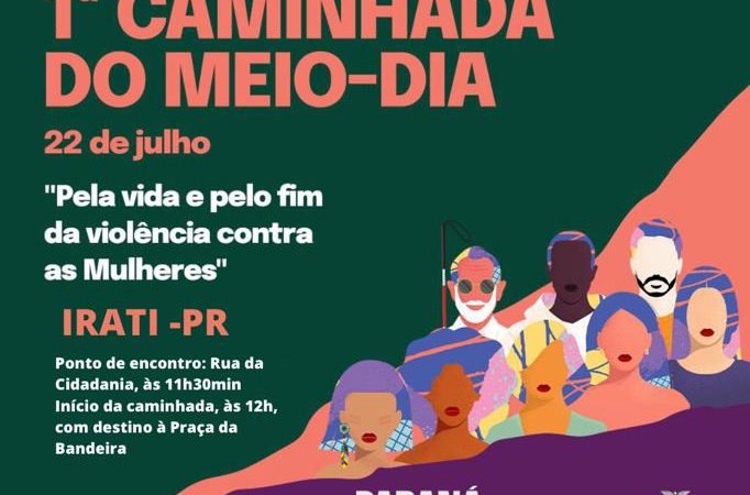 A 1ª Caminhada do Meio-Dia que abordará o tema violência contra a mulher acontecerá em Irati, no sábado. O ponto de encontro será a rua da Cidadania, a partir das 11h30. De lá, os participantes seguem com destino à Praça da Bandeira, às 12 h. Em seguida, o trajeto passa em frente à loja Afubra e o restaurante Italiano, depois em frente à Câmara Municipal, supermercado G-Center, rotatória do G-Center até ser finalizada novamente na Praça da Bandeira, às 12h40.