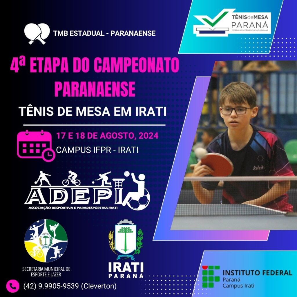 O campus iratiense do Instituto Federal do Paraná (IFPR), na Vila Matilde, sedia neste final de semana, no sábado (17) e no domingo (18), a 4ª etapa do Campeonato Paranaense de Tênis de Mesa. As três etapas anteriores foram realizadas em Londrina (27 e 28 de abril); São José dos Pinhais (25 e 26 de maio) e Foz do Iguaçu (22 e 23 de junho). Depois de Irati, ainda serão realizadas mais três etapas: Cascavel (7 e 8 de setembro); Toledo (28 e 29 de setembro) e Curitiba (19 e 20 de outubro), segundo a Federação de Tênis de Mesa do Paraná (FTMP), que promove a competição.