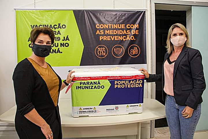 Imagem mostra prefeita em exercício, Ieda Waydizk, e secretária de Saúde, Jussara Hassen, recebendo a primeira remessa de doses da vacina contra Covid-19 na terça-feira, 19, na sede da 4ª Regional de Saúde de Irati. Foto: SECOM
