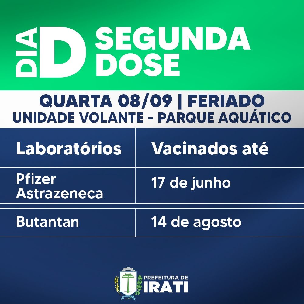 Pessoas que receberam as vacinas da Pfizer e Astrazeneca até 17 de junho, e da Coronavac até 14 de agosto, poderão tomar a segunda dose na quarta-feira, dia 8, no Parque Aquático das 8 às 16 h