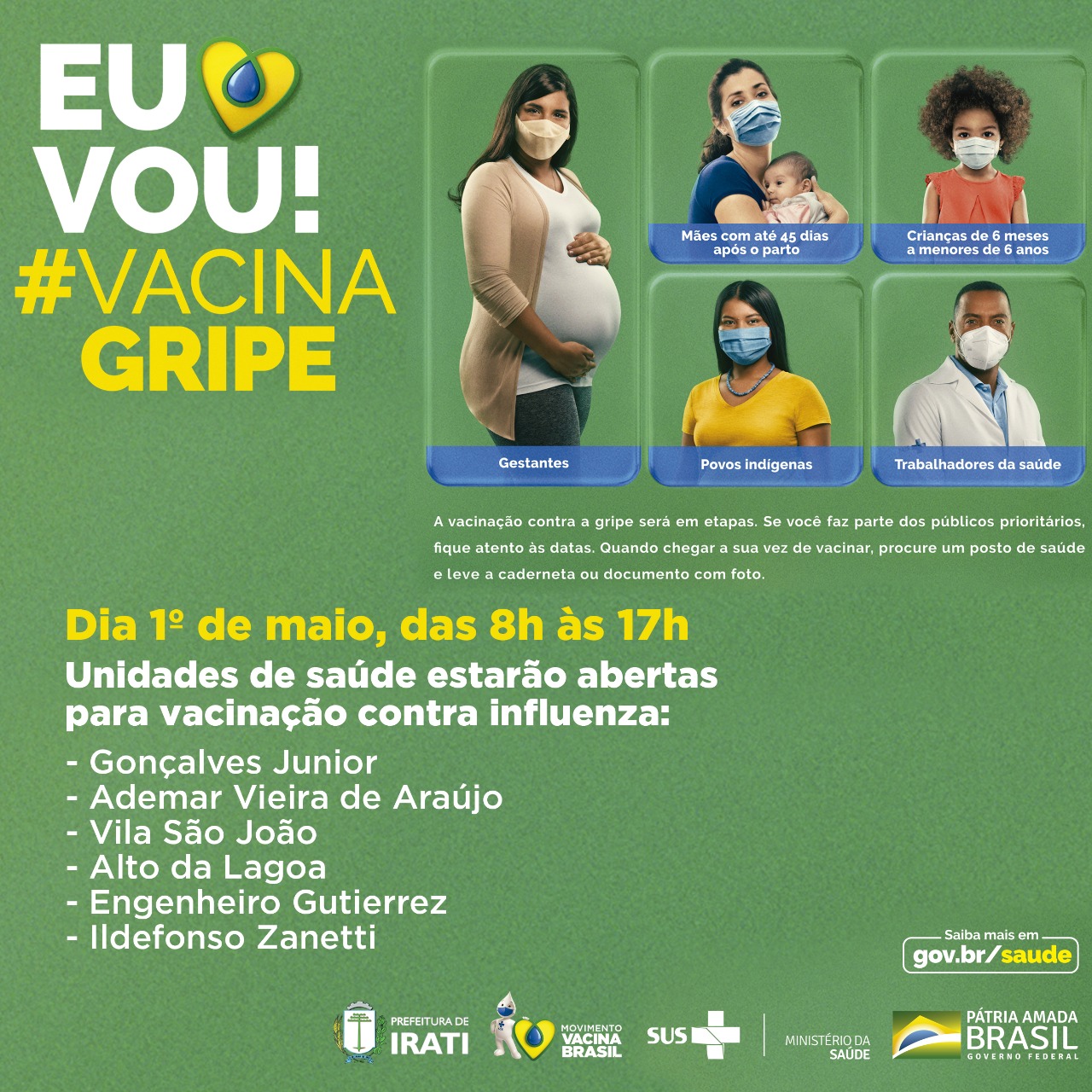 Seis unidades de saúde de Irati terão atendimento no sábado, 1º, para vacinação contra a gripe. Na área urbana estarão abertos os postos dos bairros Engenheiro Gutierrez, Alto da Lagoa e Vila São João, Adhemar Vieira de Araújo e Ildefonso Zanetti (na região central) e Gonçalves Junior no interior do município das 8 às 17 h.