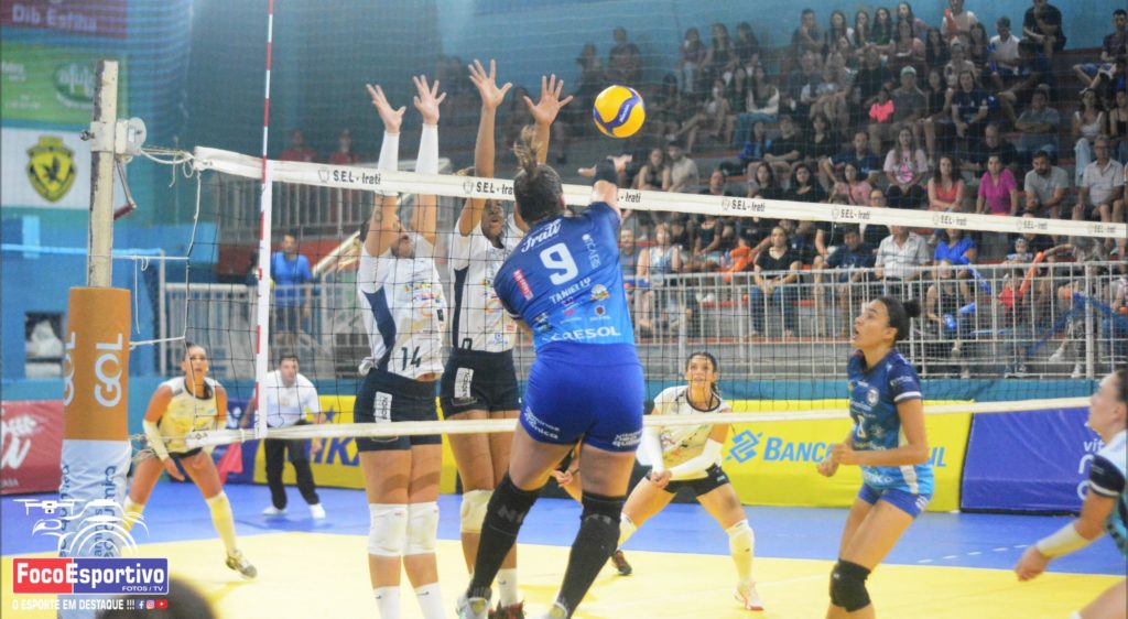 Foto mostra jogada da partida da semana passada vencida por Irati contra São Carlos, por 3 a 2, no ginásio Batatão, em Irati. No lance, atleta Tanniely ataca sobre o bloqueio adversário. Foto: Foco Esportivo