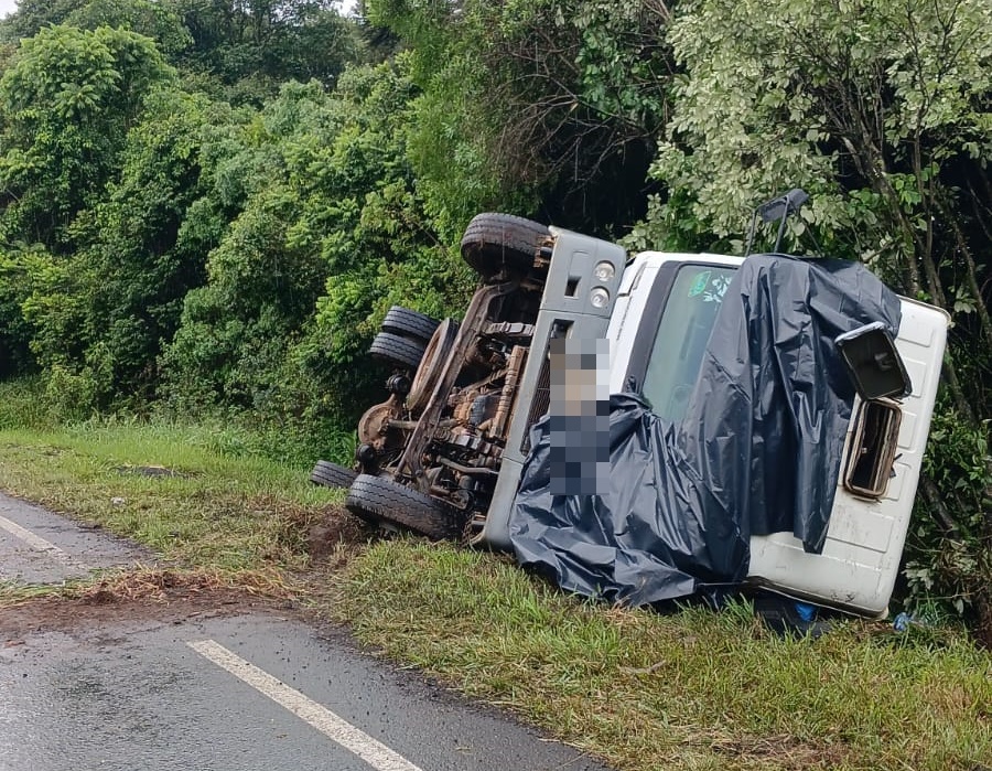 Angelim Filus de 52 anos conduzia um caminhão Volkswagen 15.180, quando saiu da pista e tombou no quilômetro 349+ 700 metros da rodovia