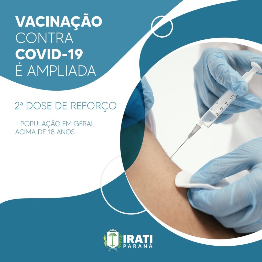 Desde quinta-feira, 10, moradores de Irati com mais de 18 anos de idade podem tomar a 4ª dose, ou segundo reforço da vacina contra a Covid-19 nas salas de vacinação do município. A aplicação da vacina está sendo feita de acordo com a disponibilidade das doses. O segundo reforço deve ser aplicado quatro meses após a aplicação da 3ª dose, seguindo recomendações do Ministério da Saúde.