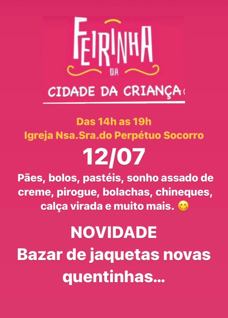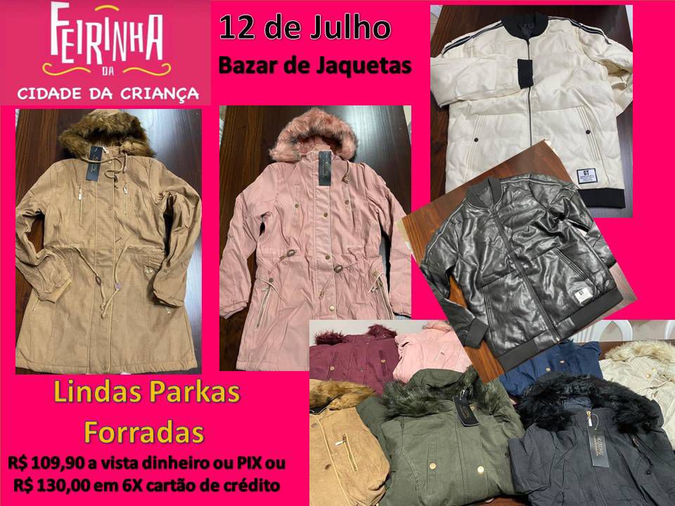 A feirinha mensal da Cidade da Criança será realizada nesta quarta-feira, das 14 às 19 h, na Paróquia Perpétuo Socorro, em Irati. A novidade entre os produtos que serão vendidos são as jaquetas forradas. O preço de cada peça disponível no bazar será de R$ 109,90 à vista (dinheiro ou pix) ou parcelado em seis vezes no cartão de crédito com valor total de R$ 130.
