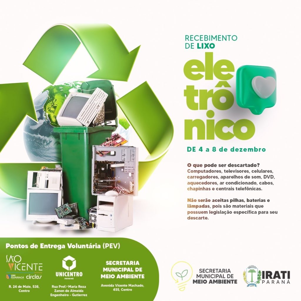 Nesta semana, a Secretaria de Meio Ambiente de Irati está realizando uma ação de recolhimento de lixo eletrônico. Os materiais poderão ser entregues até sexta-feira na secretaria, que fica na Avenida Vicente Machado (antiga sede da Agência do Trabalhador) ou nos pontos de entrega voluntária, na Faculdade São Vicente e na Universidade Estadual do Centro-Oeste do Paraná (Unicentro).