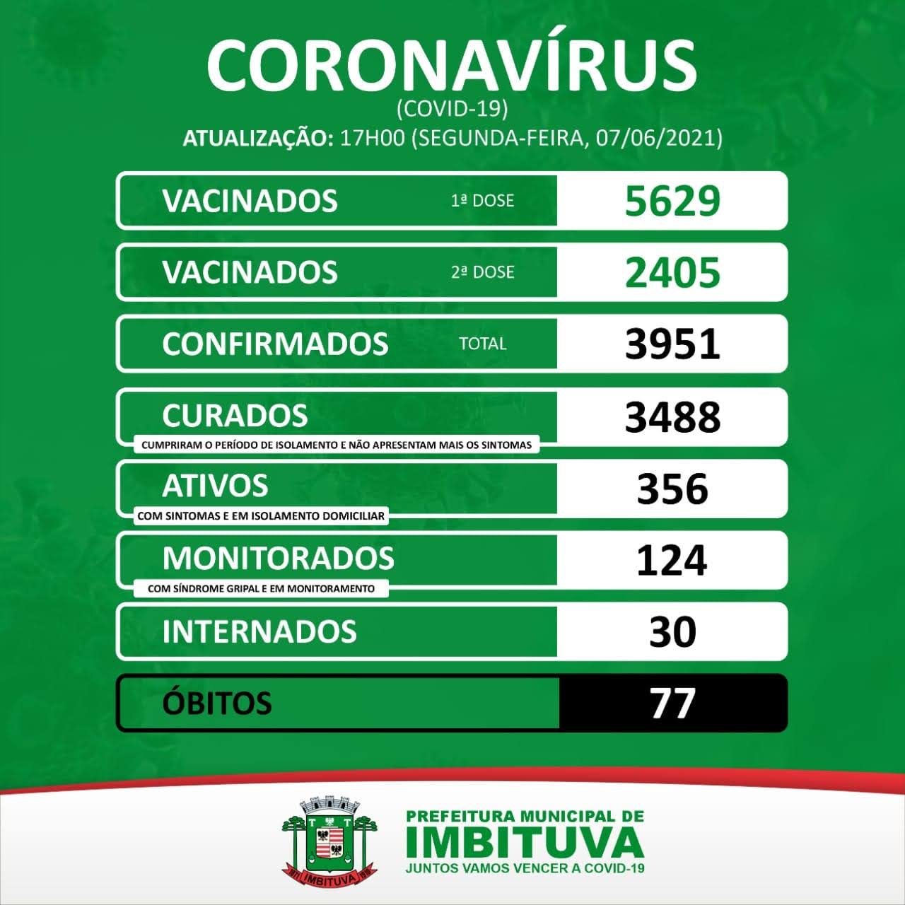 Nesta segunda-feira, 7, a secretaria de Saúde confirmou 73 novos casos da doença e comunicou que 271 munícipes finalizaram o período de isolamento e são considerados curados. No total, 3.951 casos de coronavírus já foram diagnosticados na cidade. 3.488 pessoas estão recuperadas, 356 moradores infectados estão em isolamento domiciliar, 124 imbituvenses que tiveram sintomas da infecção aguardam resultado dos exames e 30 permanecem internados, sendo 26 em hospitais de referência e quatro no Pronto Atendimento Municipal aguardando transferência.