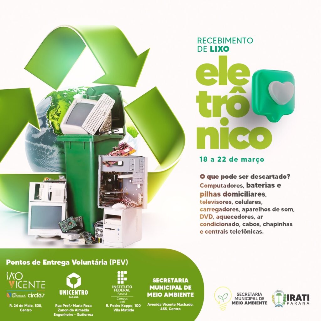 A Secretaria de Meio Ambiente de Irati está recolhendo lixo eletrônico nesta semana. Os materiais podem ser entregues até amanhã (sexta-feira) na Avenida Vicente Machado, número 455, no Centro, ou também nos Pontos de Entrega Voluntária, na Faculdade São Vicente, Instituto Federal do Paraná (IFPR) e Unicentro.