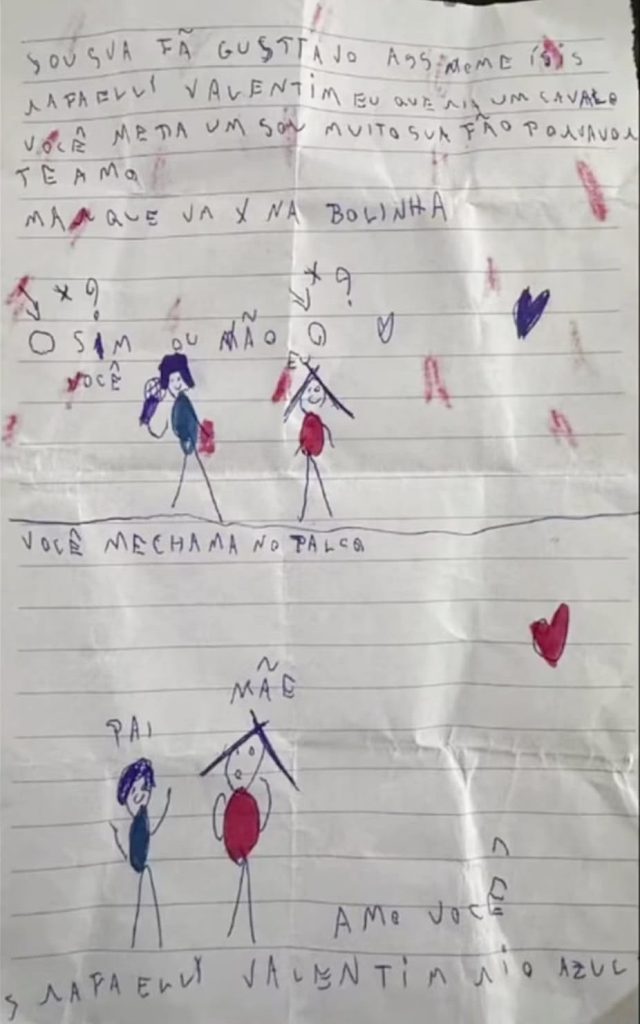 “Eu falei pra minha mãe: ‘mãe, posso fazer uma cartinha pro Gusttavo?’ Daí ela deixou”, contou. No bilhete, o pedido era direto e cheio de inocência: ganhar um cavalo. “Quando ele falou que ia me dar o cavalo, eu senti muita emoção. Na hora eu pensei que era brincadeira. Eu não acreditei”, disse Isis. A ficha só começou a cair depois. “Eu até bati a cabeça para ver se eu estava sonhando… me belisquei também”, contou, arrancando risos.