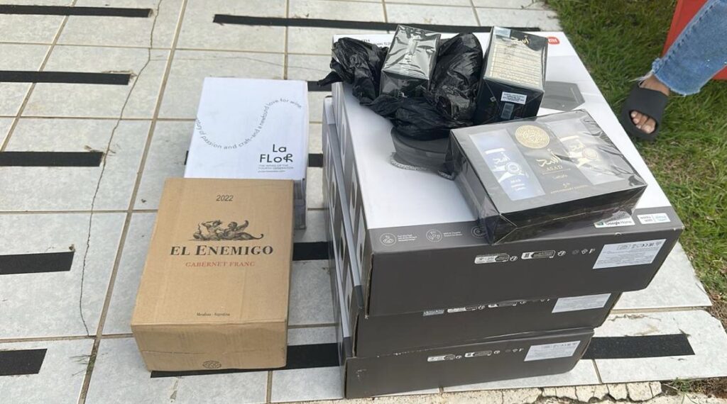 Foram apreendidos vinhos argentinos, um robô utilizado como aspirador de pó e perfumes. Os produtos apreendidos têm um custo de aproximadamente R$ 12 mil. Segundo a Receita Federal, a apreensão ocorreu em função do valor ser maior que a cota permitida para compras no exterior e por ter destinação comercial, já que foram apreendidas 60 garrafas de vinhos.