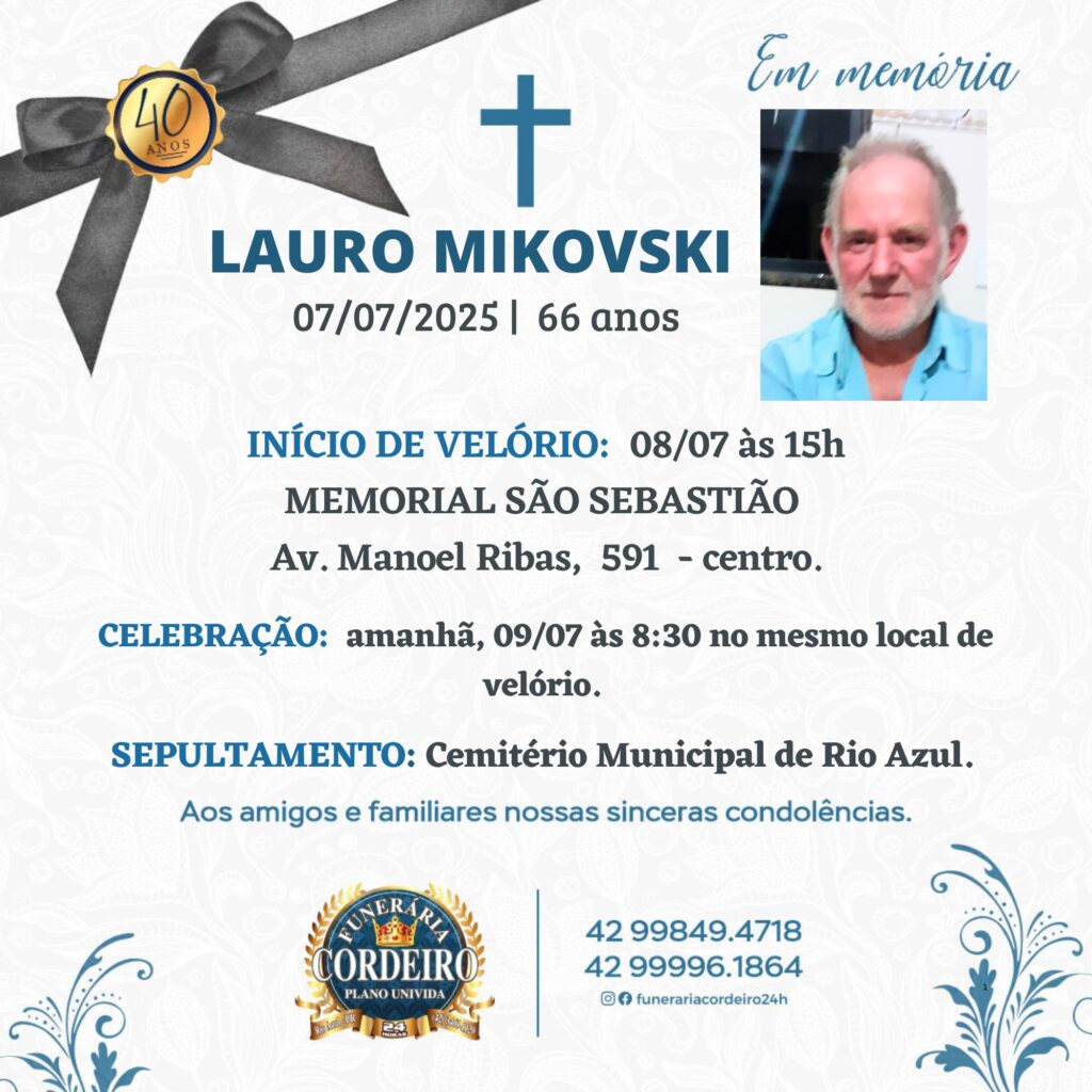 O condutor do caminhão, de 35 anos, não sofreu ferimentos. Já Lauro não resistiu aos ferimentos e morreu no local. O corpo dele foi encaminhado para o Instituto Médico-Legal (IML) de União da Vitória e liberado na tarde de hoje. O velório está acontecendo no memorial São Sebastião, em Rio Azul. Neste mesmo local será realizada uma celebração nesta quarta-feira, às 8h30. Em seguida, o corpo segue para o sepultamento no Cemitério Municipal de Rio Azul. Lauro era morador da localidade de Rio Vinagre, em Rio Azul. Ele deixou a esposa e quatro filhos.