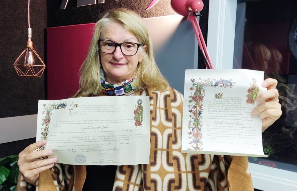 O homem, com quem ela conversou era brasileiro e que faria o mesmo percurso, se chama Rogério e é tenente-coronel do Corpo de Bombeiros em Florianópolis/SC. “Já me senti segura. Foi um caminho onde acabei encontrando cinco brasileiros e isso já me deu segurança para fazer. Depois, claro, cada um foi seguindo, fazendo seu caminho. Eu terminei o caminho com um brasileiro de Curitiba, o nome dele é Paulo, e uma croata. Foi uma experiência extraordinária. Muito cansativa, erros que eu cometi, na época, por falta de experiência, e coisas que eu fui aprendendo como me cuidar para que eu não tivesse problemas com lesões, para que eu tivesse condições de terminar o caminho”, comenta.