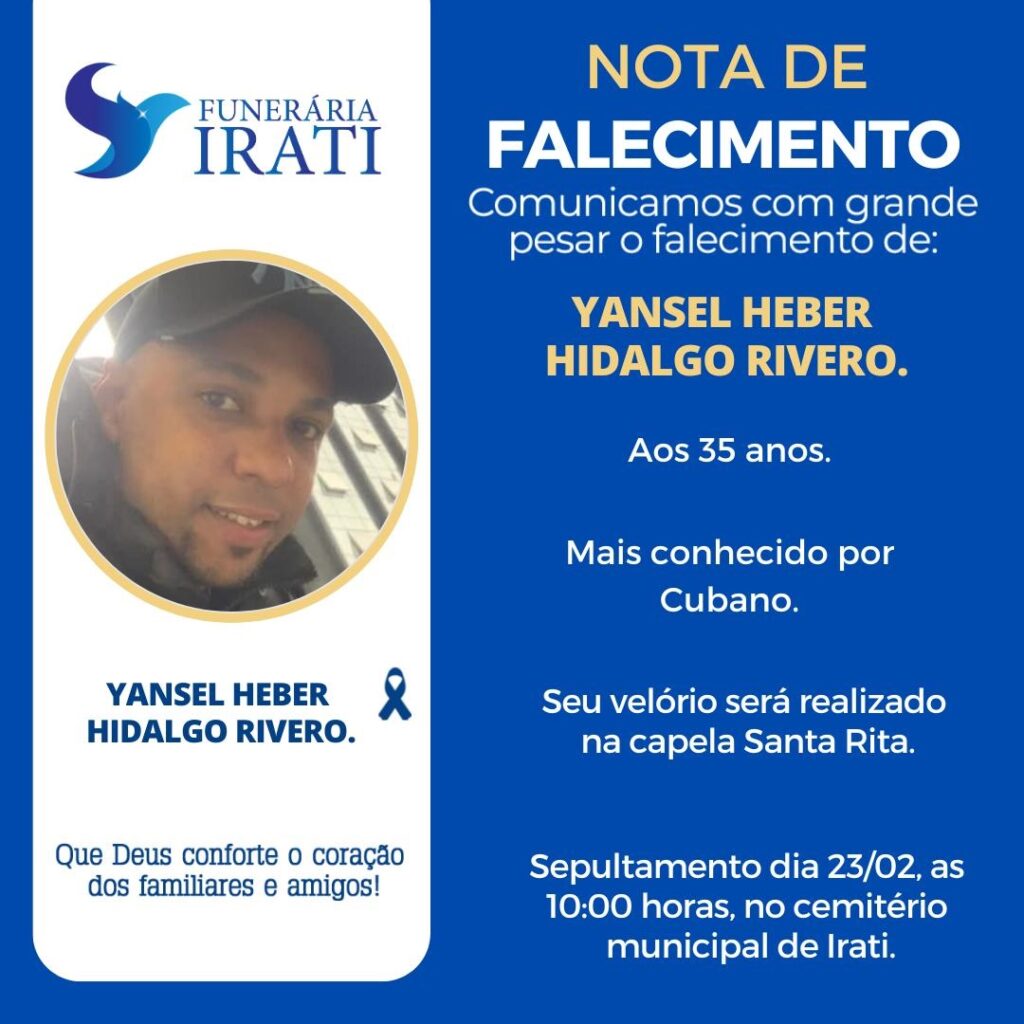 O motociclista, de 35 anos, de nacionalidade cubana, não resistiu aos ferimentos e faleceu. Ele foi identificado como Yansel Heber Hidalgo Rivero, conhecido por “cubano”. O corpo dele foi encaminhado ao Instituto Médico-Legal (IML) de União da Vitória. Ele será velado na Capela Santa Rita, em Irati. Já o sepultamento será na manhã de domingo, no Cemitério Municipal de Irati. O condutor do Gol, de 60 anos, ficou ferido e foi encaminhado ao Pronto Atendimento Municipal. A moto e o carro estavam em situação regular e foram liberados.