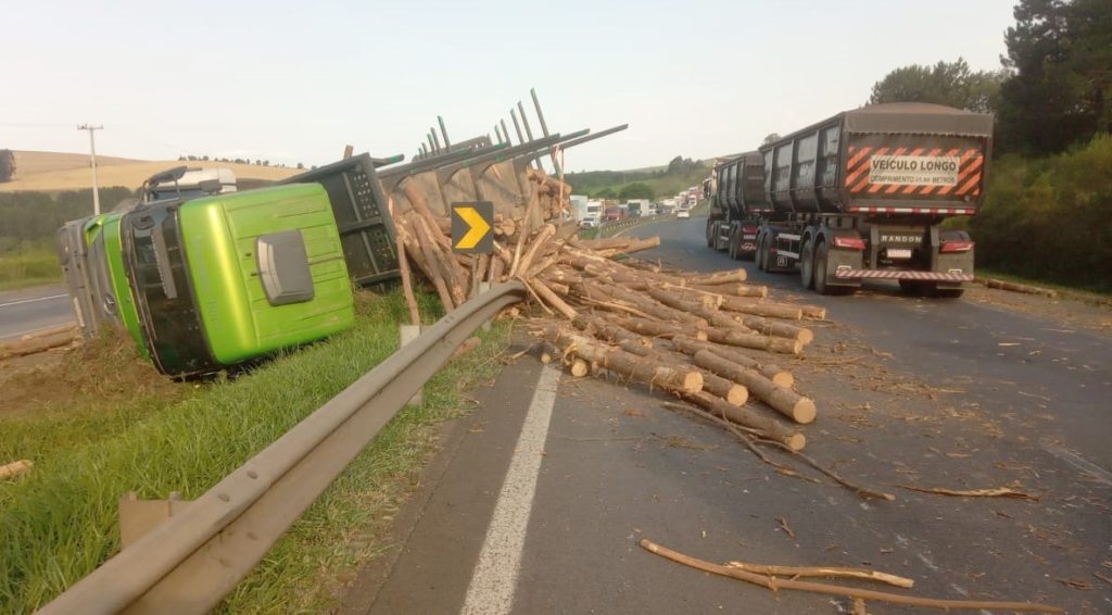 Caminhão carregado com madeira tomba na BR-376: Na BR-376, em Ponta Grossa, um caminhão Mercedes Benz tombou no canteiro central da rodovia, na tarde de ontem. O motorista não se feriu. O caminhão estava carregado de madeiras, que caíram sobre a via. Por isso, houve necessidade de interditar uma faixa no sentido Curitiba e outra em direção ao interior do Estado. Segundo a PRF, a fila nos dois sentidos chegou a 4 quilômetros em um determinado período.