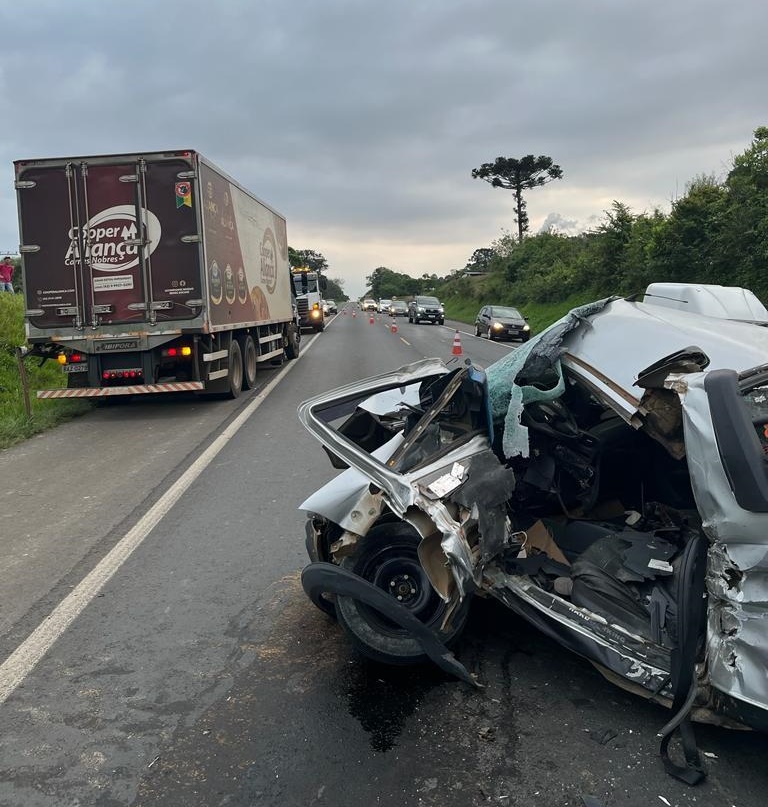 Um motorista sofreu ferimentos graves após um acidente na BR-373, na localidade de Bracatinga, em Prudentópolis, na tarde de sexta-feira. A colisão envolveu um veículo Fiat Strada e um caminhão Mercedes Benz Atego 3030.