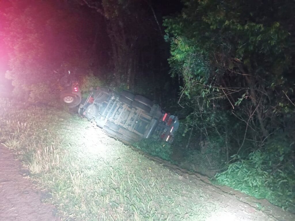 Um caminhão Mercedes Benz Axor 1933 tombou na BR-373, em Ipiranga, na madrugada de hoje. O veículo emplacado em Ivaí estava carregado com gasolina e diesel, mas não houve vazamentos dos combustíveis, segundo a Polícia Rodoviária Federal (PRF).