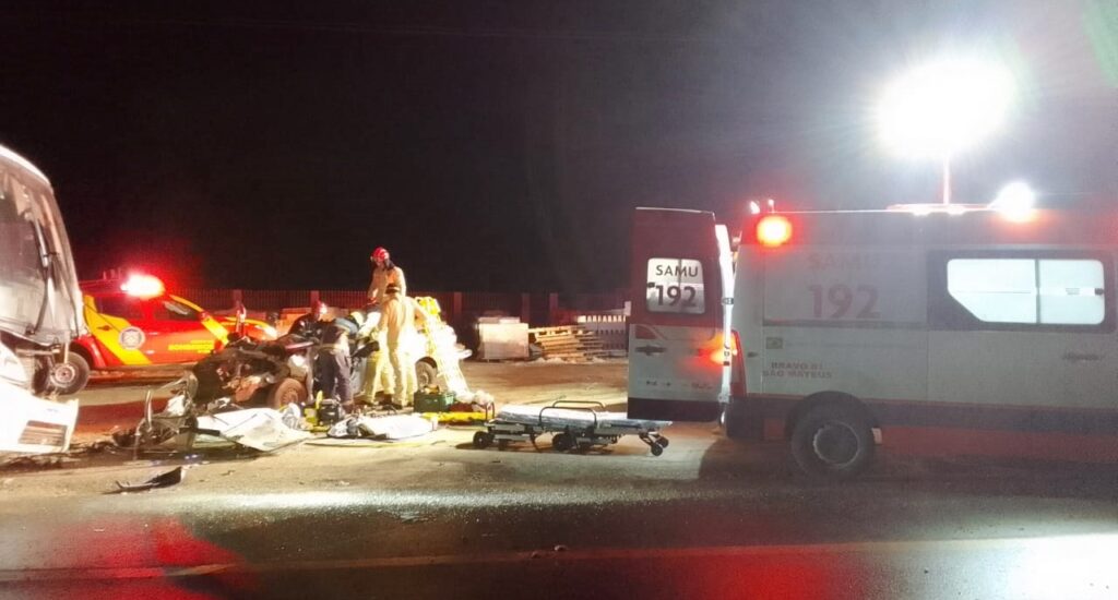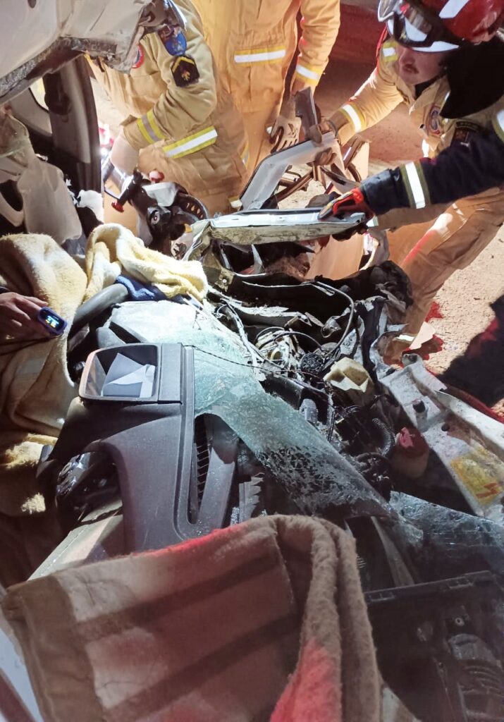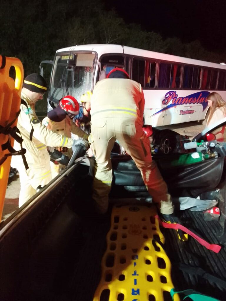 Uma mulher foi resgatada das ferragens de um carro após um acidente na BR-476, em São Mateus do Sul, na madrugada de hoje. A colisão envolveu um ônibus e um veículo Montana. Bombeiros, profissionais do SAMU e da Polícia Rodoviária Federal (PRF) foram acionados para prestar atendimento no local.