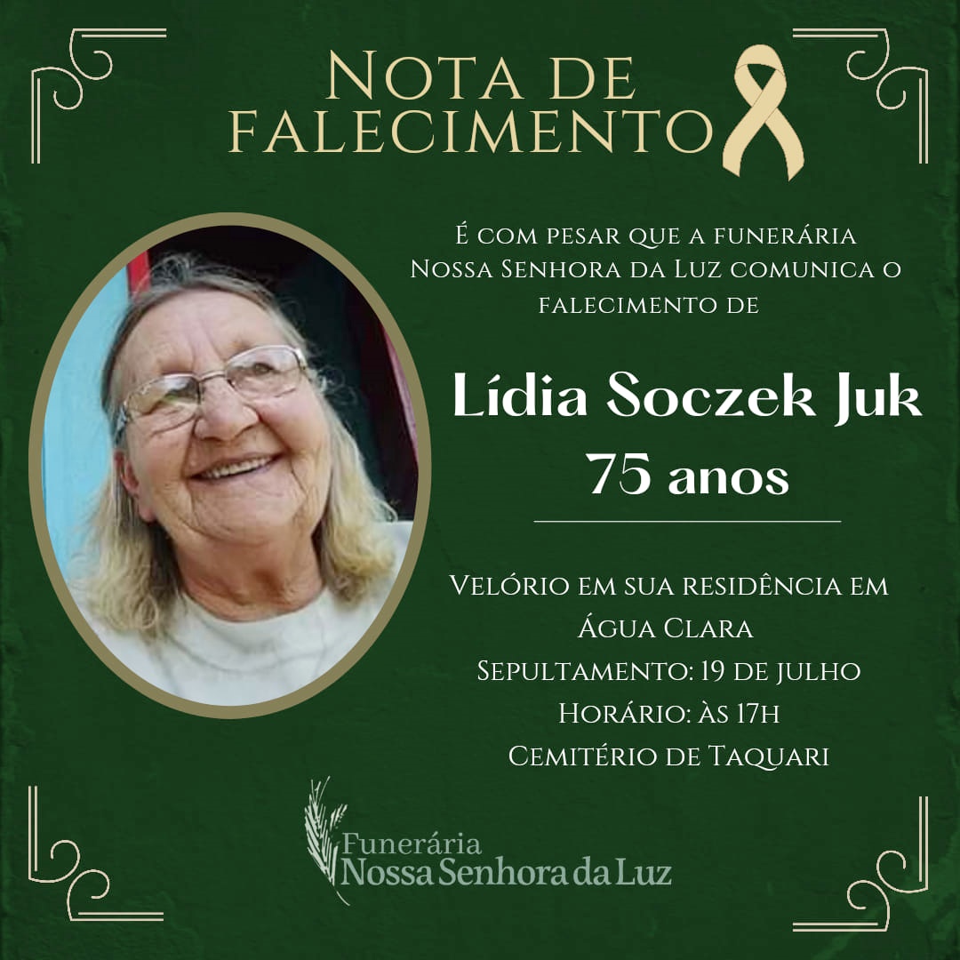 A passageira Lídia Soczek Juk, de 75 anos, não resistiu aos ferimentos e morreu no local. O corpo dela foi encaminhado ao Instituto Médico-Legal (IML) de União da Vitória antes de ser liberado para o velório que está acontecendo em sua residência na localidade de Água Clara, em Irati. Já o sepultamento ocorrerá no Cemitério do Taquari, às 17 h.