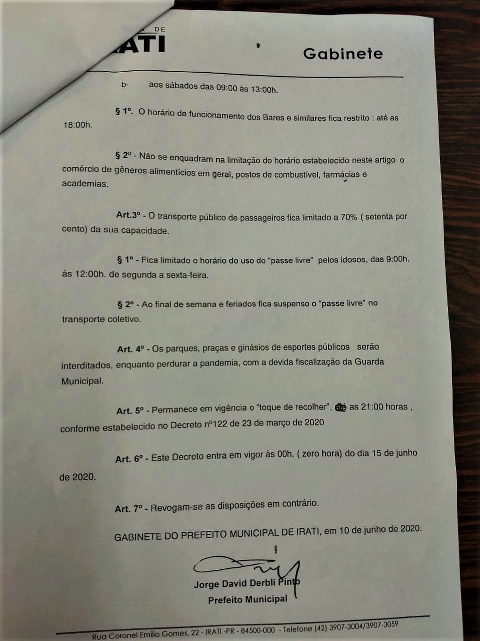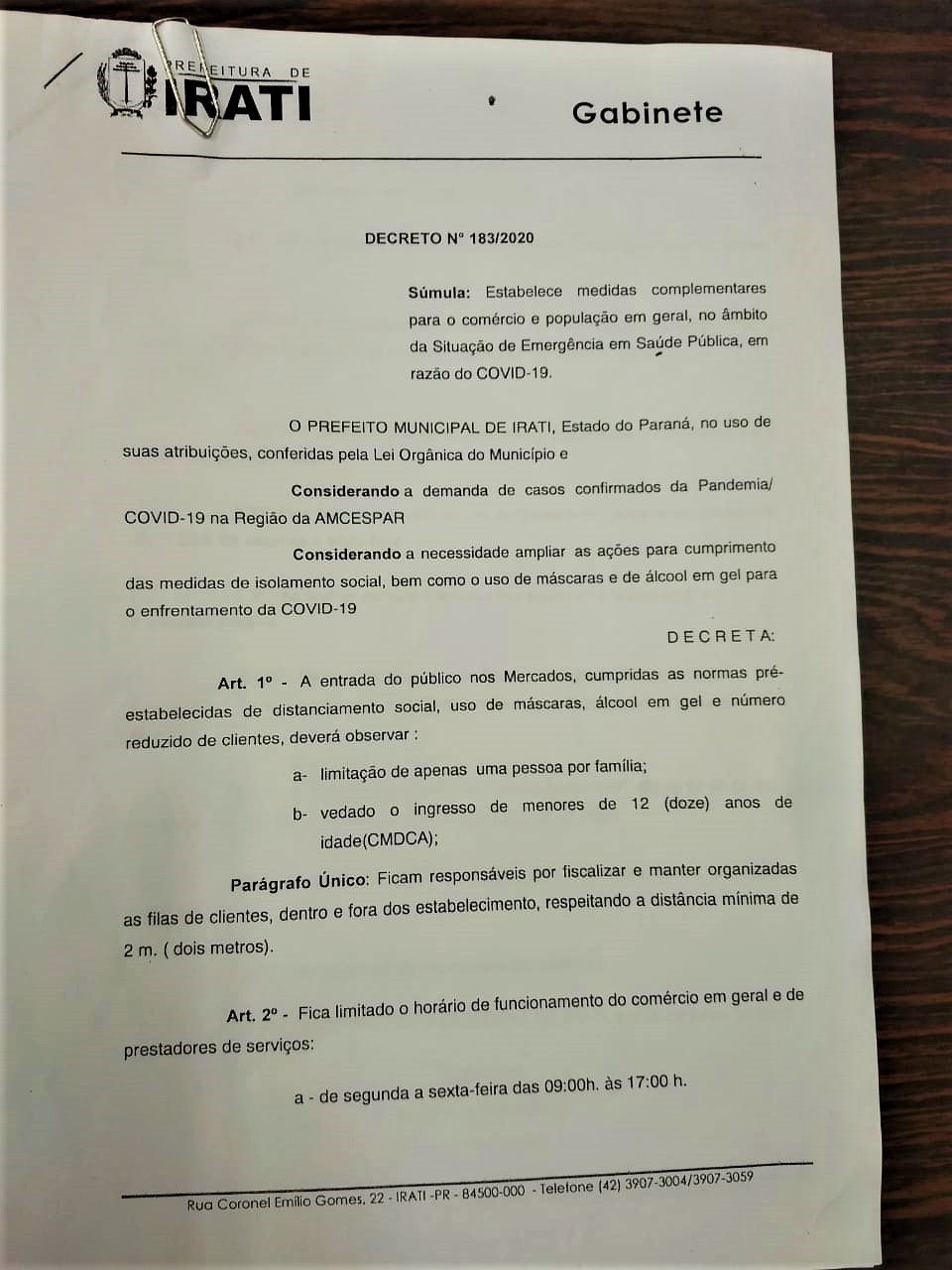 Desde segunda-feira (15), bares e comércio de Irati estão com novos horários de funcionamento em virtude da pandemia de coronavírus (Covid-19). Os horários foram estabelecidos pelo decreto nº 183/2020.