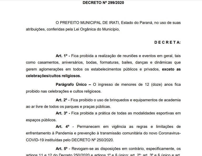 O decreto 299 foi publicado na manhã de hoje, 9, e entrou em vigor imediatamente. Ele proíbe a realização de reuniões e eventos em geral, como casamentos, aniversários, bodas, formaturas, bailes, danças e dinâmicas que gerem aglomerações em todos os estabelecimentos públicos e privados, exceto as celebrações e cultos religiosos. A entrada de menores de 12 anos em celebrações e cultos religiosos está proibida. A partir de agora também não será permitido o uso de brinquedos e equipamentos de academia ao ar livre de todos os parques e praças públicas. A prática de modalidades esportivas em espaços públicos também foi proibida. O decreto tem validade de 14 dias, ou seja, até o dia 22 de novembro.