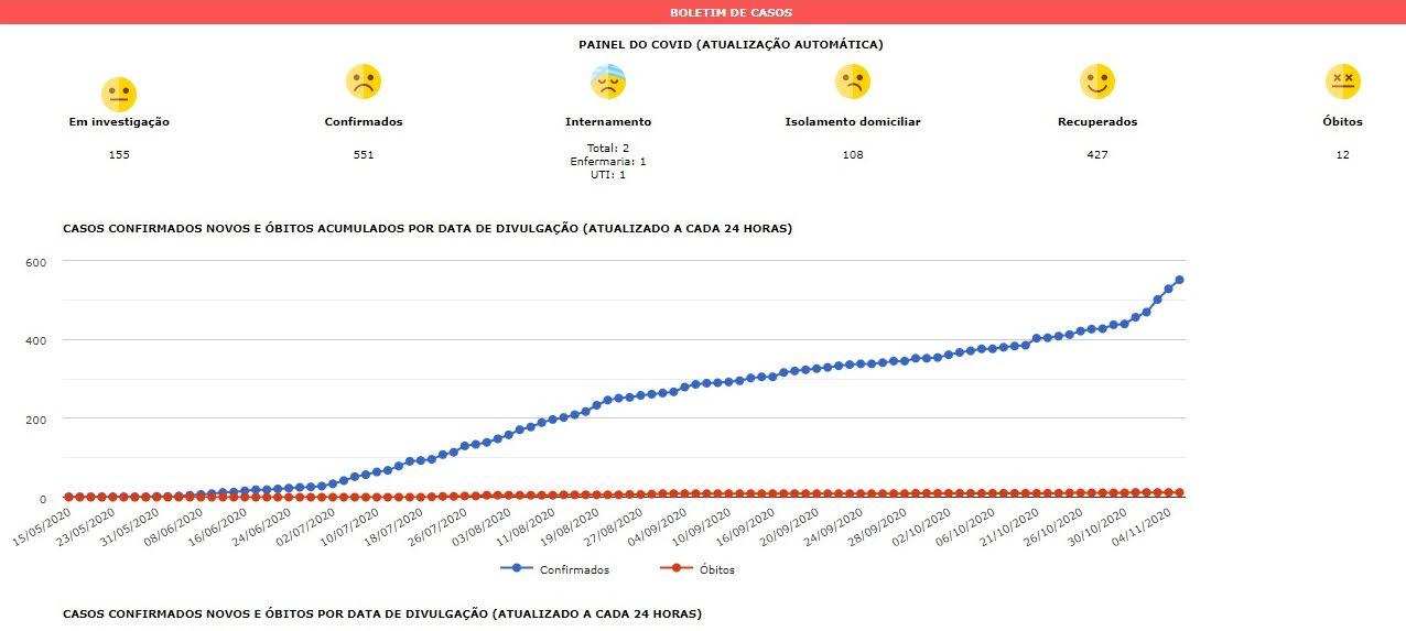 Entre os infectados, 108 moradores permanecem em isolamento domiciliar. Mais 155 pessoas aguardam resultado do exame laboratorial. Doze iratienses morreram por complicações causadas pela Covid-19.
