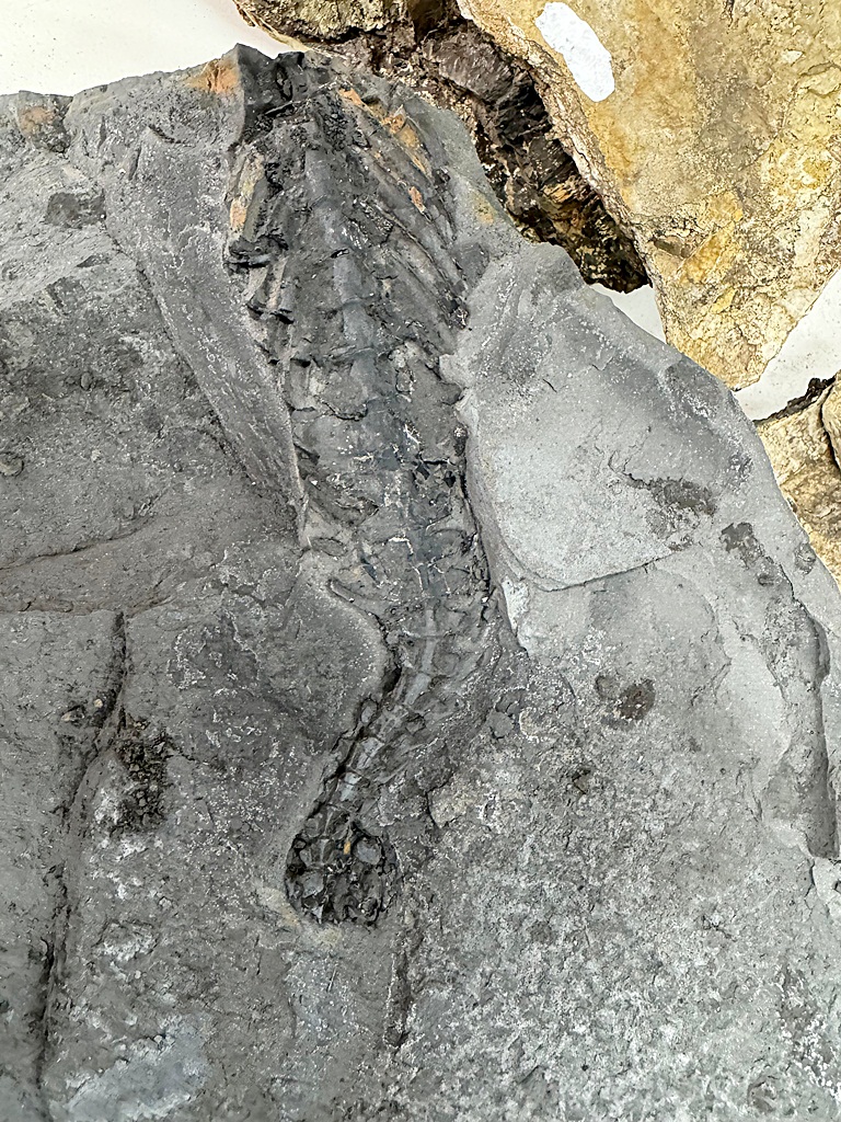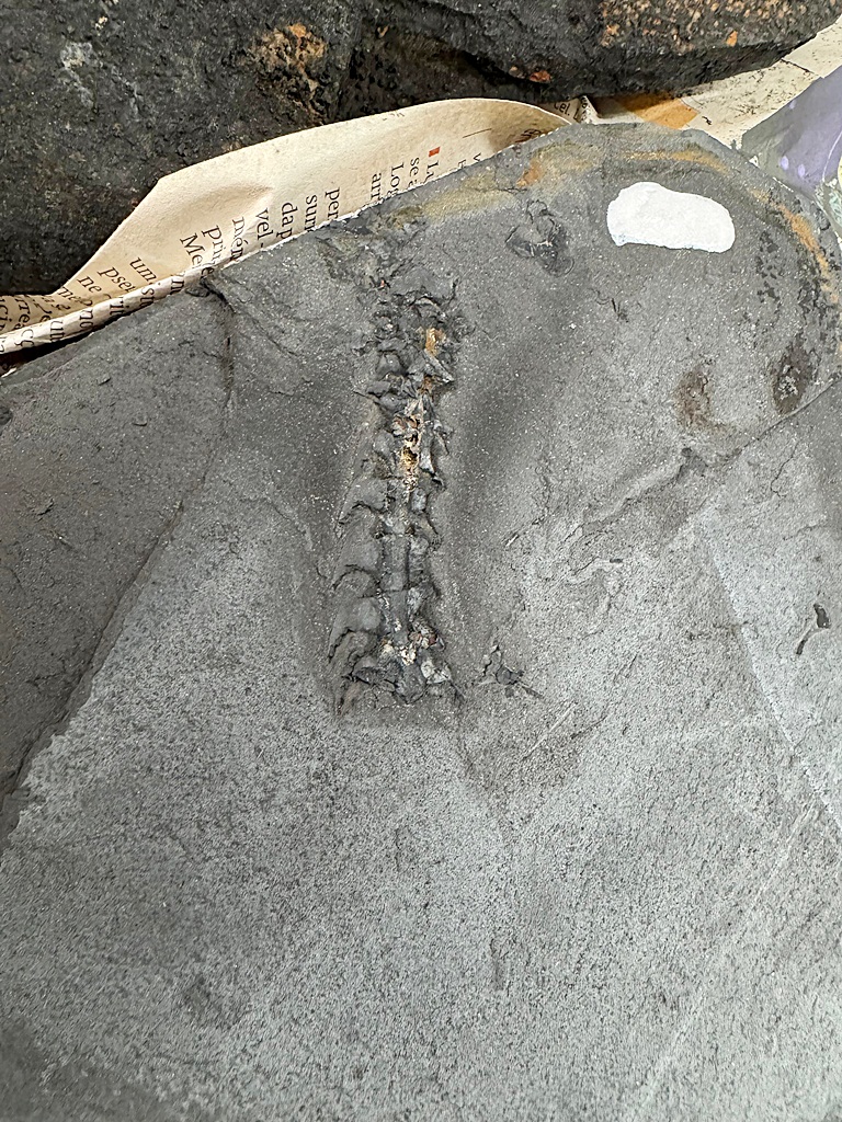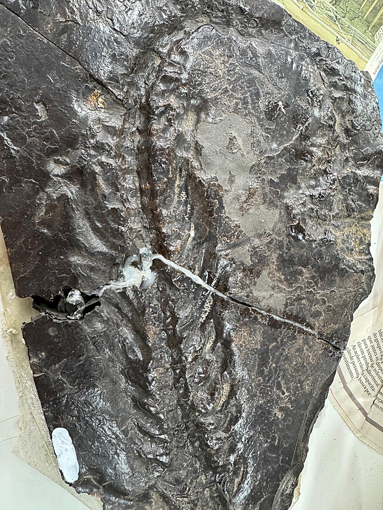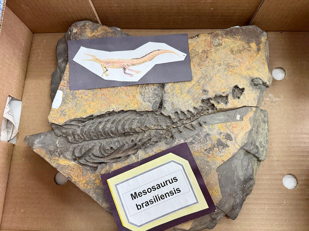 Entre os fósseis encontrados, está o de uma espécie conhecida como Mesossaurus Brasiliensis, um réptil considerado como um dos antepassados dos dinossauros, que viveu há cerca de 280 milhões de anos na região, antes ainda da separação dos continentes. “Aqui nós temos um dos mais conhecidos, que é o Mesossaurus Brasiliensis. É um fragmento dele, e provavelmente à primeira vista, vemos uma parte da coluna, das vértebras, das costelas, alguns fragmentos e também de outros fósseis bem fininhos, que são os dentes do Mesossaurus Brasiliensis. Não é o único fóssil que encontramos aqui: como répteis, já foram encontrados dois aqui na região”, afirmou.