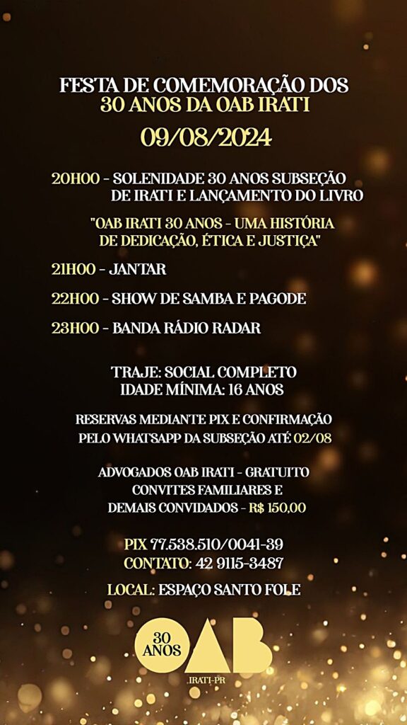 Jantar e lançamento de livro – No mesmo dia, a OAB irá promover um jantar em comemoração aos 30 anos da instituição em Irati, no Espaço Santo Fole. A partir das 20 horas, deverá acontecer a solenidade alusiva aos 30 anos da instituição, com lançamento do livro “OAB Irati 30 anos – uma história de dedicação, ética e justiça”. Marinho contou como a obra foi realizada.