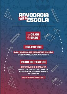 A subseção regional de Irati da Ordem dos Advogados do Brasl (OAB) promoverá na próxima sexta-feira, 09, o programa “Advocacia vai à escola”, a partir das 08h30min no Espaço Santo Fole. A palestra será ministrada pela desembargadora do Tribunal Regional do Trabalho da 9ª Região, Rosemarie Diedrichs Pimpão. Logo depois, será apresentada a peça teatral “Construindo Cidadania”, realizada pelo Grupo de Teatro da Caixa de Assistência dos Advogados do Paraná”.