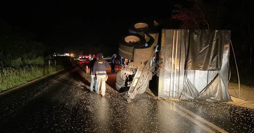 Semirreboque de caminhão com carga de milho tombou na BR-277, em Palmeira, após acidente na madrugada deste sábado. Foto: PRF/Divulgação