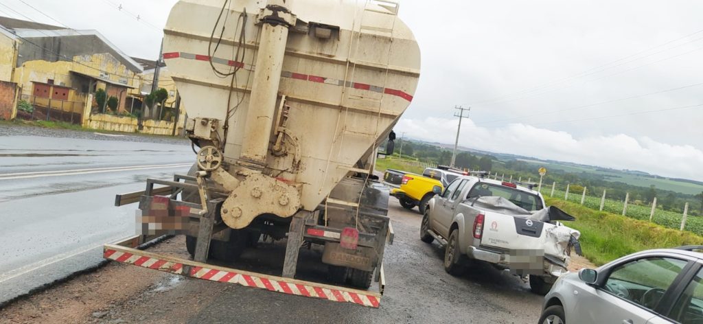 Três veículos se envolvem em acidente na PR-151, em Ponta Grossa: Já na PR-151, em Ponta Grossa, foi registrado um acidente entre três veículos na tarde de ontem. A batida envolveu um caminhão Iveco Tector, um veículo Ford Fusion e uma caminhonete Nissan Frontier. Os motoristas que eram três homens, sendo dois com 42 anos e um de 63, escaparam ilesos. Já a passageira da caminhonete, de 62 anos, teve ferimentos leves e foi conduzida para um hospital de Ponta Grossa. Ela recebeu atendimento do Corpo de Bombeiros.