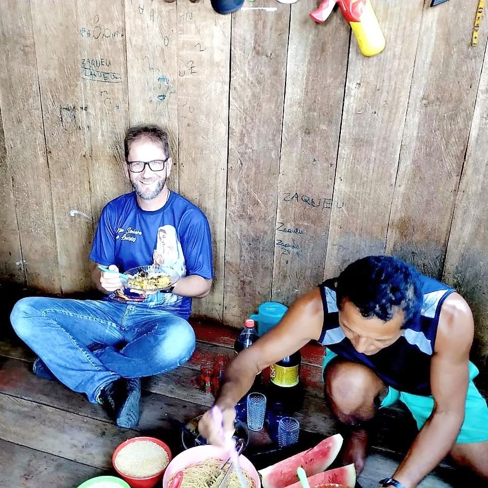Já nas comunidades que estão à beira do rio, a rotina se transforma. O padre conta que segue viagem pelo rio, entrando em cada comunidade. “Nós temos 20 comunidades na beira do rio. Nós entramos no barco e quando começamos a subir o rio, nós paramos um dia em cada comunidade. Nós paramos com o barco, nós descemos do barco, visitamos todas as casas. Muitas casas em situações muito precárias socialmente. Casas que não tem nem aonde você se sentar, você tem que se sentar no chão. A própria comida eles servem no chão, serve um café, um bolinho, na hora do almoço ou alguma outra coisinha no chão. Nós sentamos muitas vezes para se alimentar no chão. Depois de visitar todas as casas, nós reunimos as pessoas num determinado local. Algumas comunidades têm igreja, outras comunidades não têm igreja, então reunimos na escola ou reúnem num centro que tem alguma cobertura. Faz toda a parte da catequese, da evangelização”, explica.