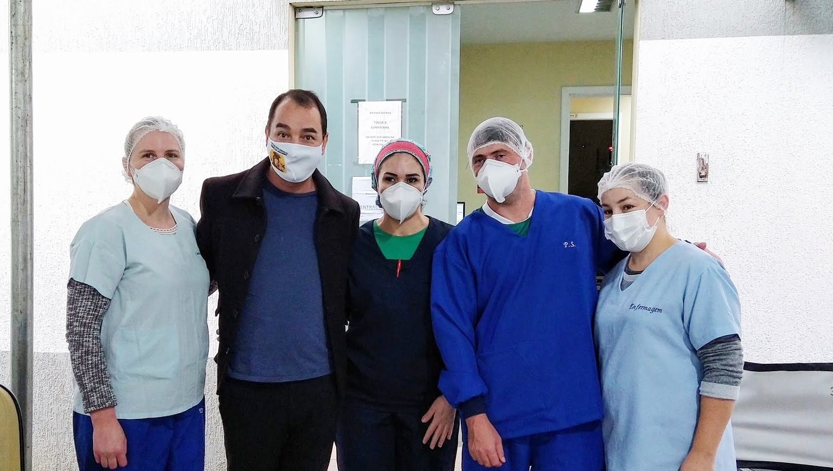 | Padre Nelson tirou foto ao lado dos funcionários da Santa Casa de Irati após receber alta do hospital. Foto: Facebook/Reprodução |