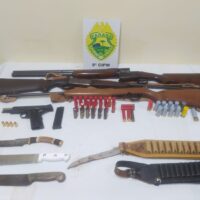 Policiais apreenderam quatro armas, munições, dois facões, uma faca, entre outros objetos com os dois…