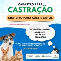 Entre 150 a 200 animais serão castrados por meio do programa estadual em fevereiro. Inscrições…